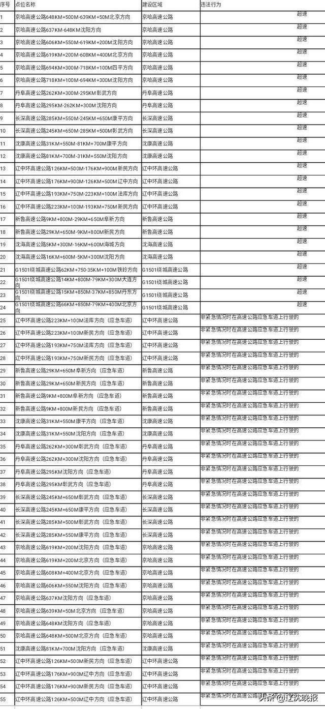 8月26日,沈陽市公安局交通警察局發布消息,為了更好的發揮科技設施在交通管理中的作用,進一步規范行車秩序和行車安全,沈陽市新建“電子警察”55處。其中G1501繞城高速公路4處,丹阜高速公路6處, 京哈高速公路14處, 遼中環高速公路12處, 沈海高速公路2處, 沈康高速公路5處, 新魯高速公路6處, 長深高速公路6處。主要抓拍超速;非緊急情況時在高速公路應急車道上行駛的交通違法行為。